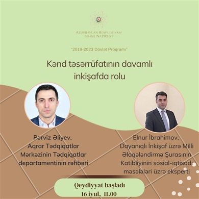 “2019-2023 Dövlət Proqramı” çərçivəsində 16 iyul 2021-ci il, saat 11:00-da “Kənd təsərrüfatının davamlı inkişafda rolu” mövzusunda vebinar keçiriləcək.